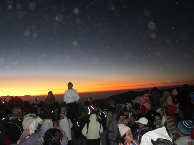 Although it was still dark, many people hurry their walks. Nobody wanted to miss the sunrise, so did we. Moreover, we struggled to be here. Hehehe. Then, slowly a white light appear. I hold my breath. From the dark, here came the light. We saw the sunrise. It was wonderful. The sunrise with the mountain background. Although, there were some clouds, it was still awesome.