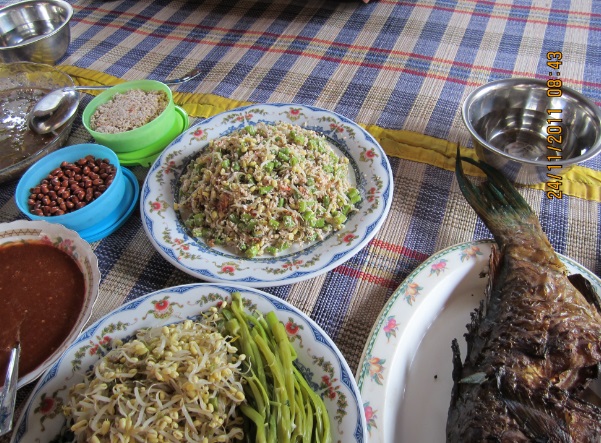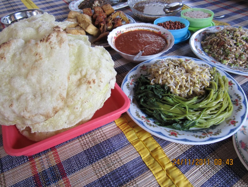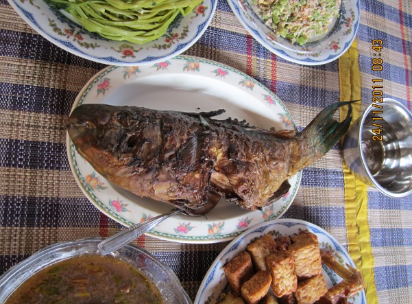 Setelah basa-basi sebentar, kami pun dipersilakan untuk makan. Kami segera duduk lesehan dan mengelilingi makanan. Ada berbagai macam menu makanan dan tidak semuanya aku tahu. Aku pun bertanya kepada si keponakan.