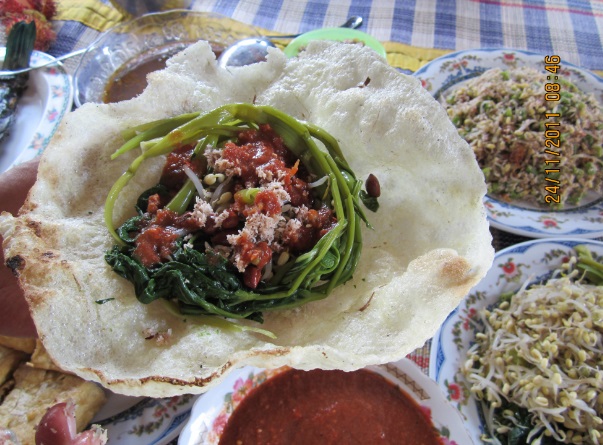Rebusan kangkung Lombok yang lebih besar dari kangkung Jawa yang renyah, dipadu dengan sambal mentah yang segar, perasan jeruk nipis, dan parutan kelapa muda. Hm, sedap. Apalagi opaknya bisa dimakan juga. Mengingatkanku akan semanggi yang dimakan dengan kerupuk puli yang terbuat dari singkong juga. Beberapa kali aku makan plecing kangkung di Lombok, tapi baru kali ini menggunakan alas opak.