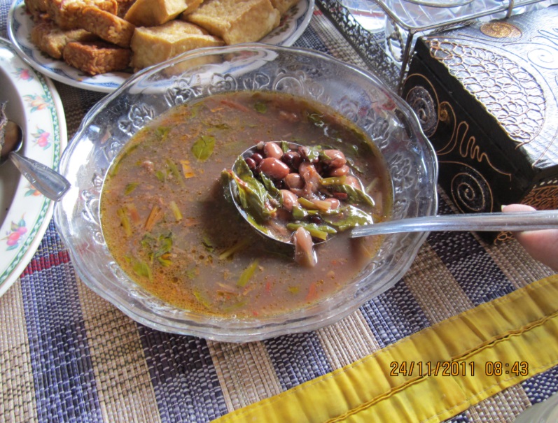 Ini ada sayur yang aku tidak tahu namanya. Rasanya asam, seperti sayur asam di Jawa. Ternyata namanya sayur tolang antap. Tolang itu biji, antap itu kacang panjang. Oke, nama sayurnya menjelaskan isinya. Rasanya asam karena memang ditambah asam atau bagik, dalam Bahasa Lombok.