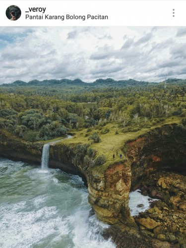 Lagi-lagi Pacitan nih. Selain Banyu Tibo ternyata Pacitan juga mempunyai Karang Bolong. Dinamakan demikian karena disana terdapat karang dengan lubang yang sangat besar. Disampingnya terdapat air terjun yang langsung jatuh ke laut. Cuma sangnya saat musim kemarau air terjun ini sangat kecil debitnya.